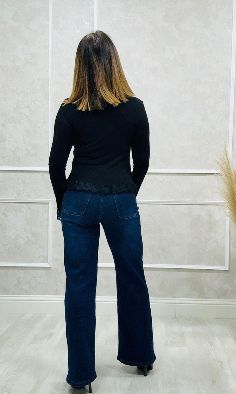 El jersey tiene un diseño de encaje en la parte inferior, cuello y en las muñecas que añaden un toque elegante al jersey.