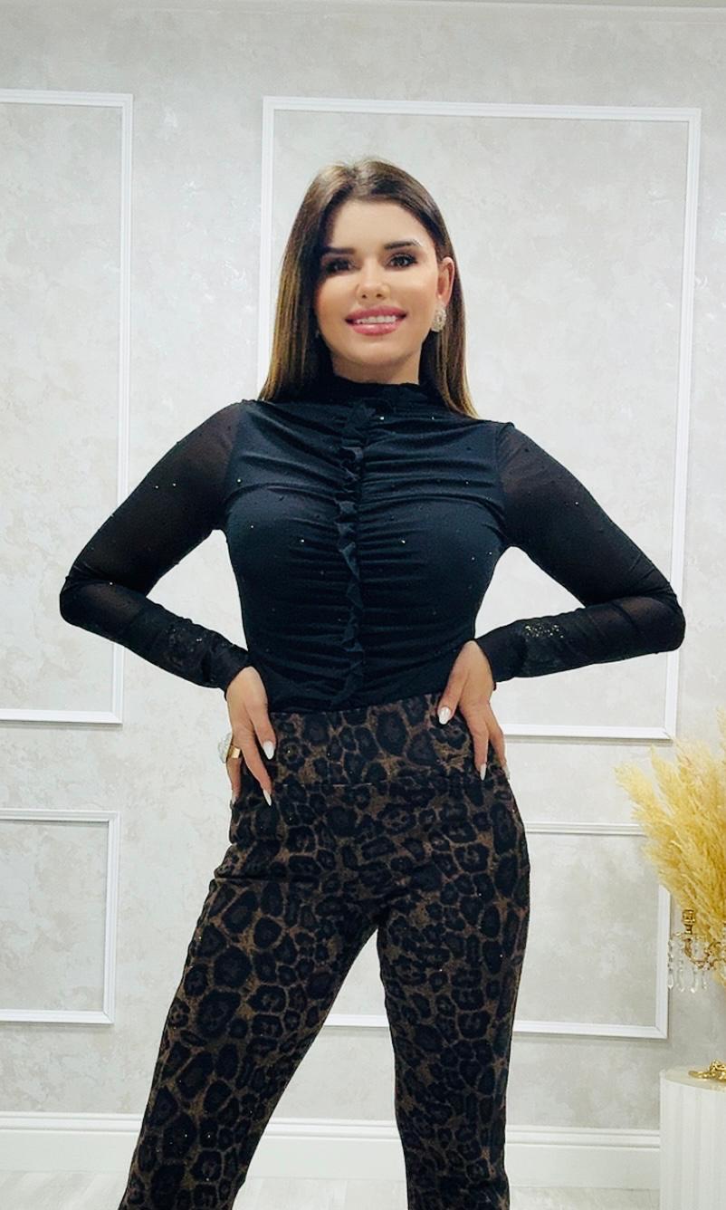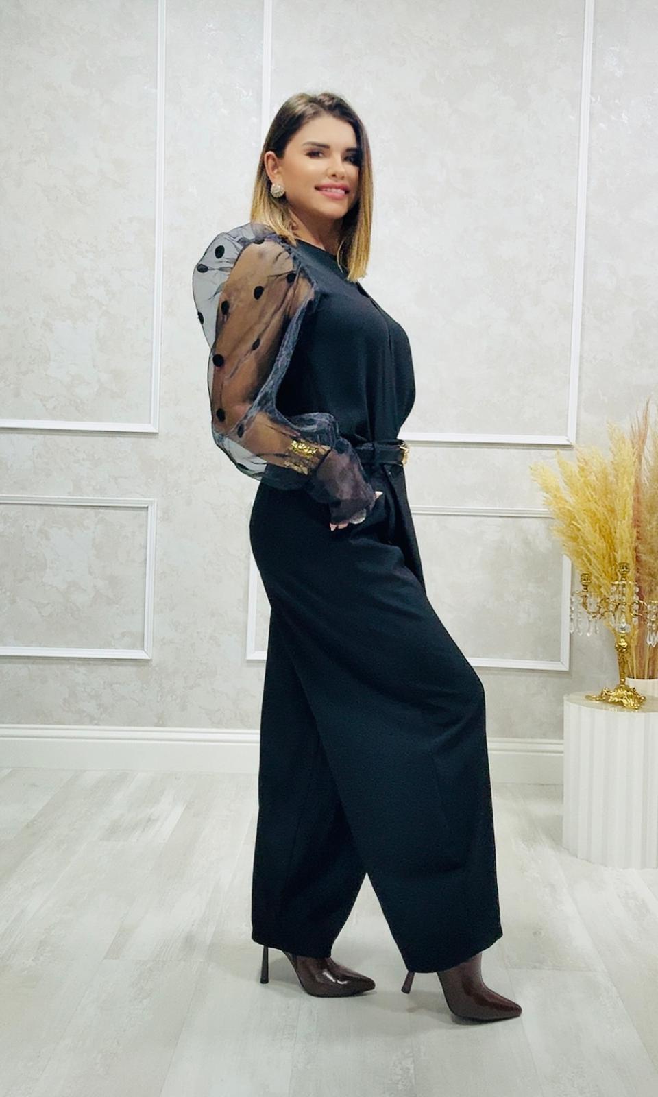 Las mangas y la parte trasera transparente y trae una bonita decoración de pedrería en negro.