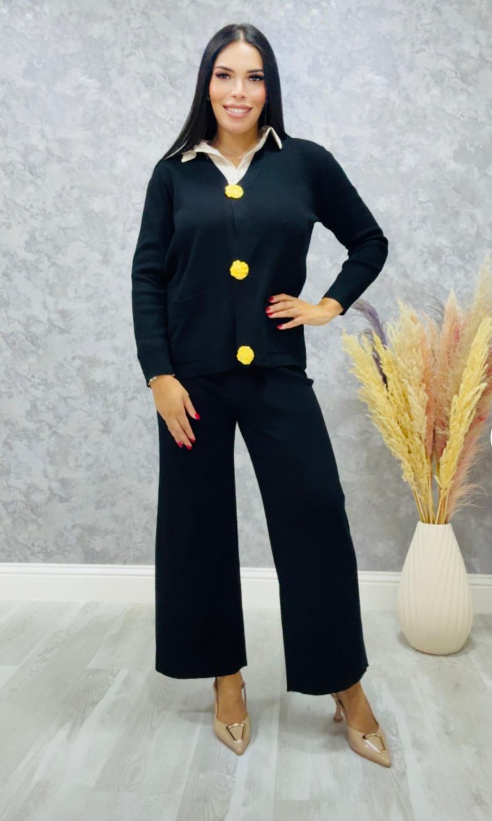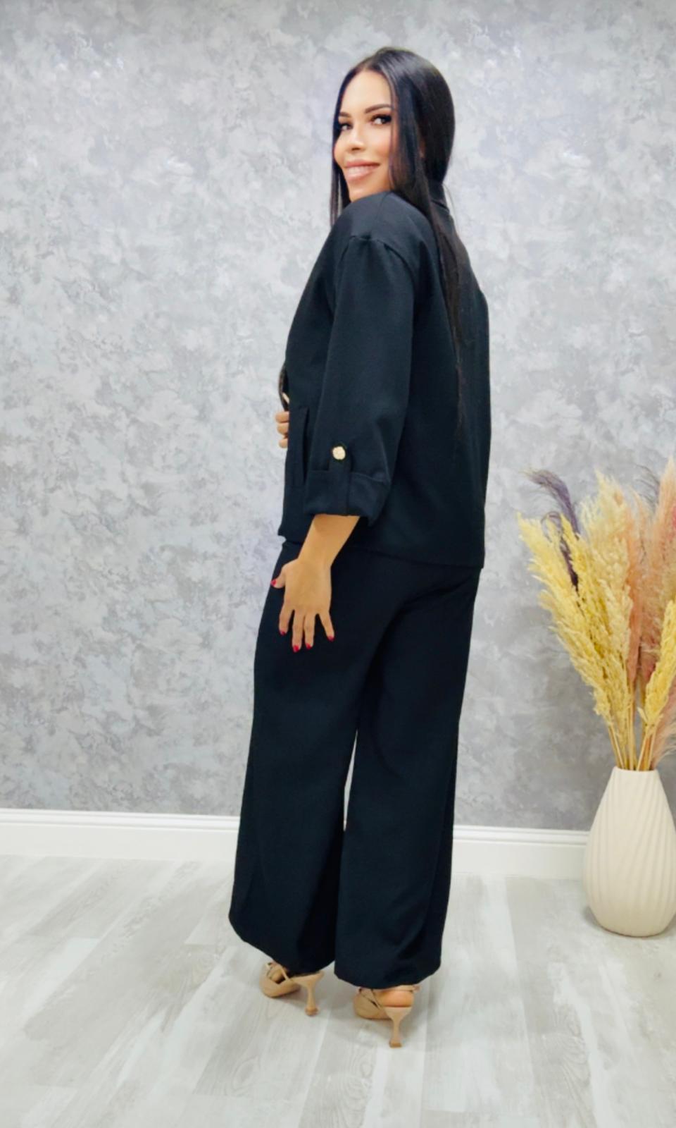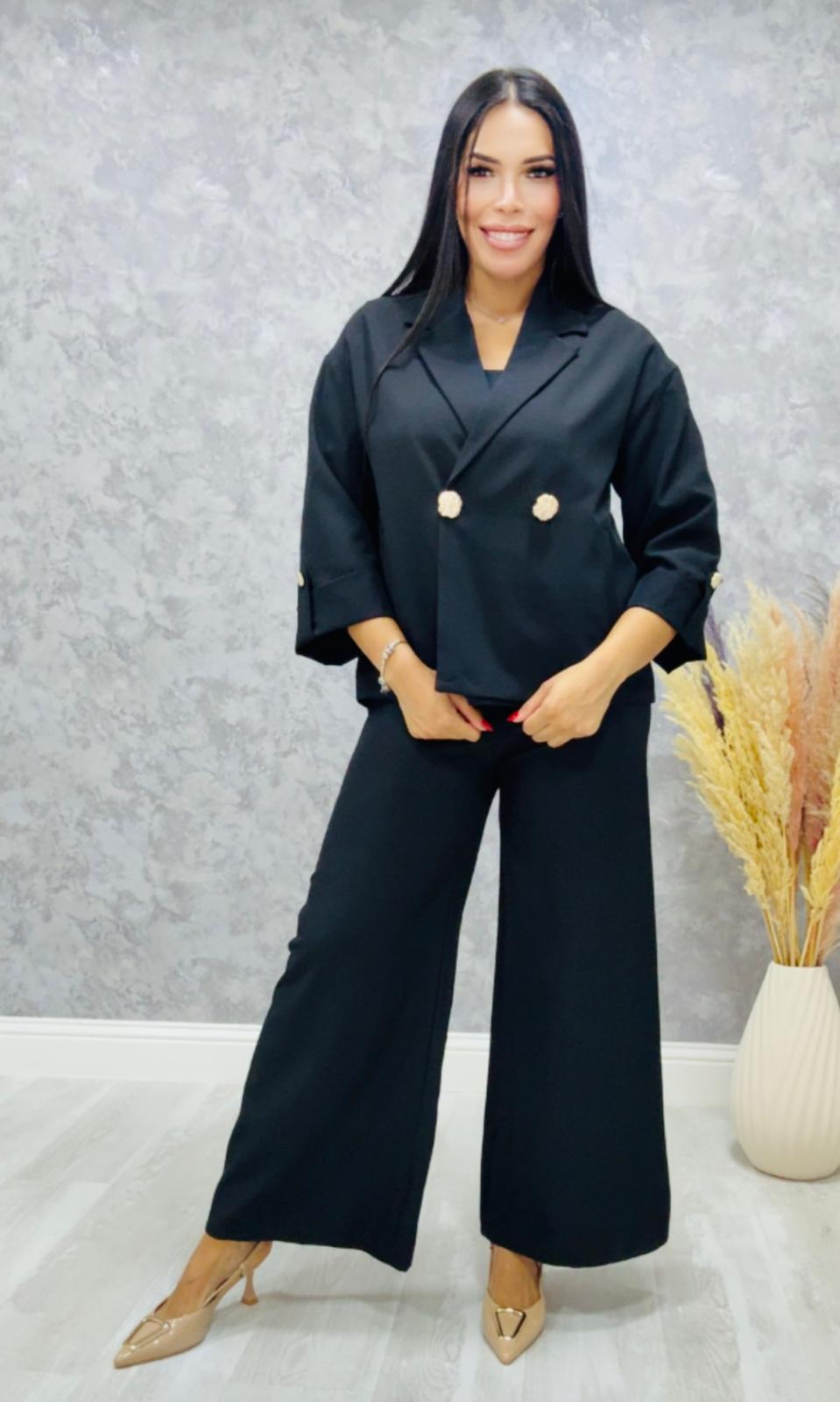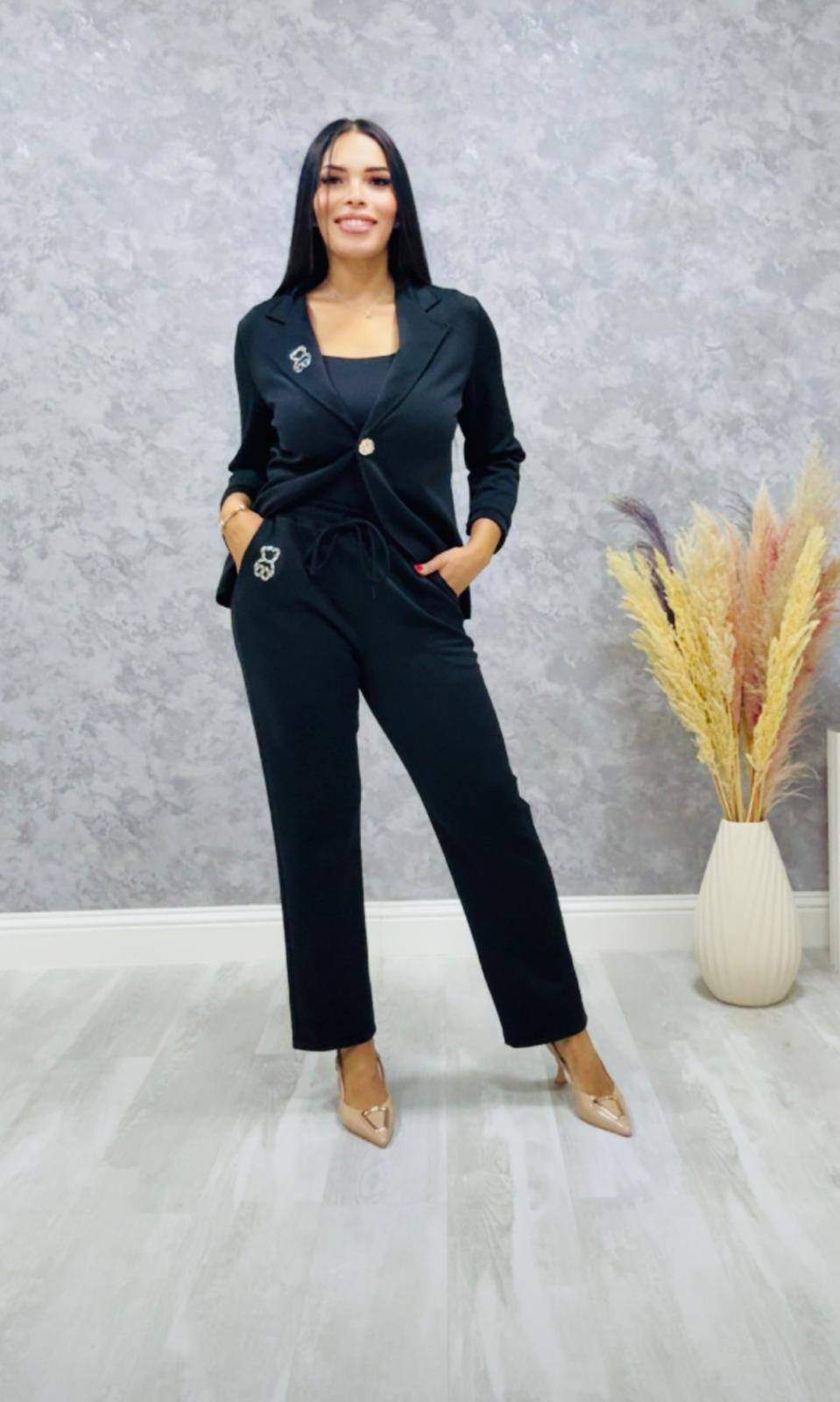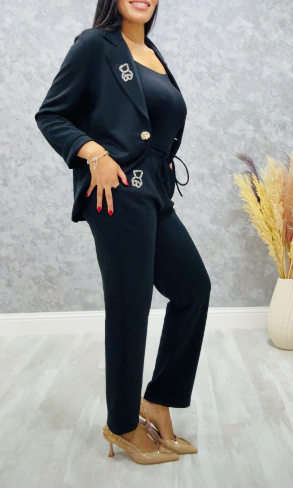 La blazer tiene bolsillo y viene con forro, el pantalón lleva goma en la cintura
