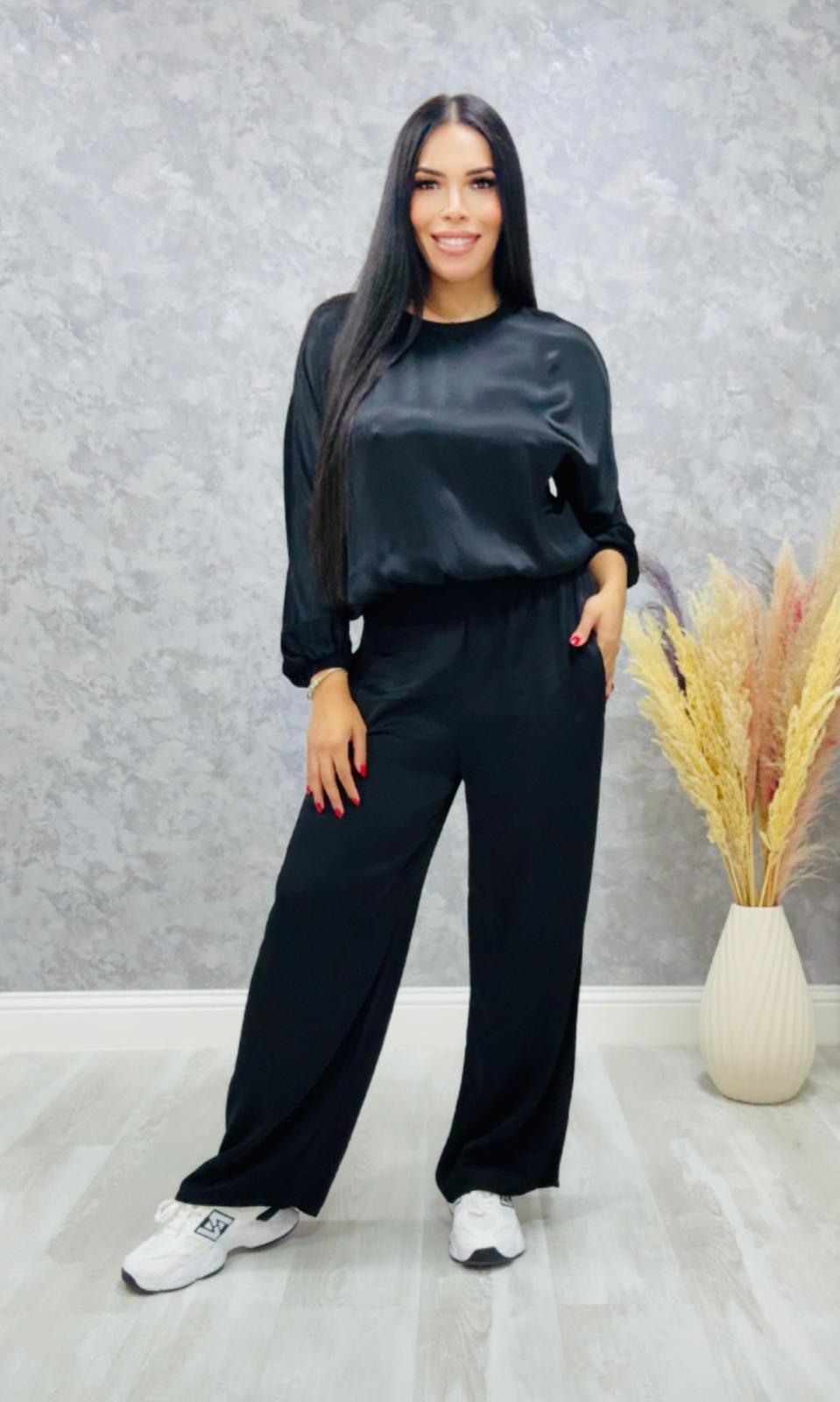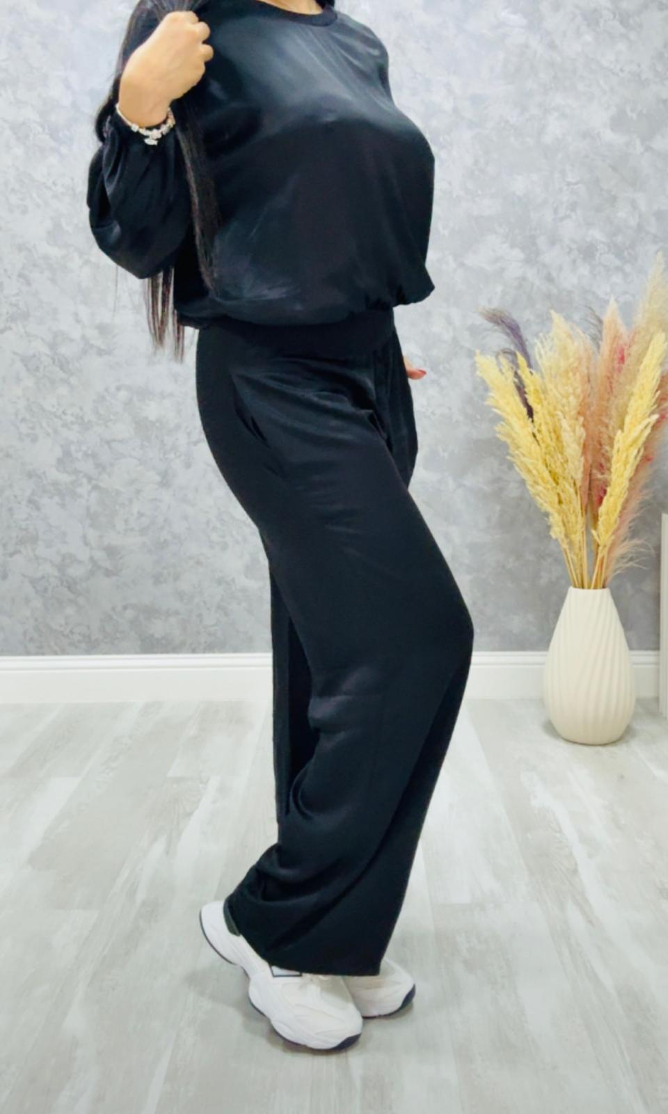 Tela no elástica satinada, el pantalón lleva goma en la cintura y bolsillos laterales