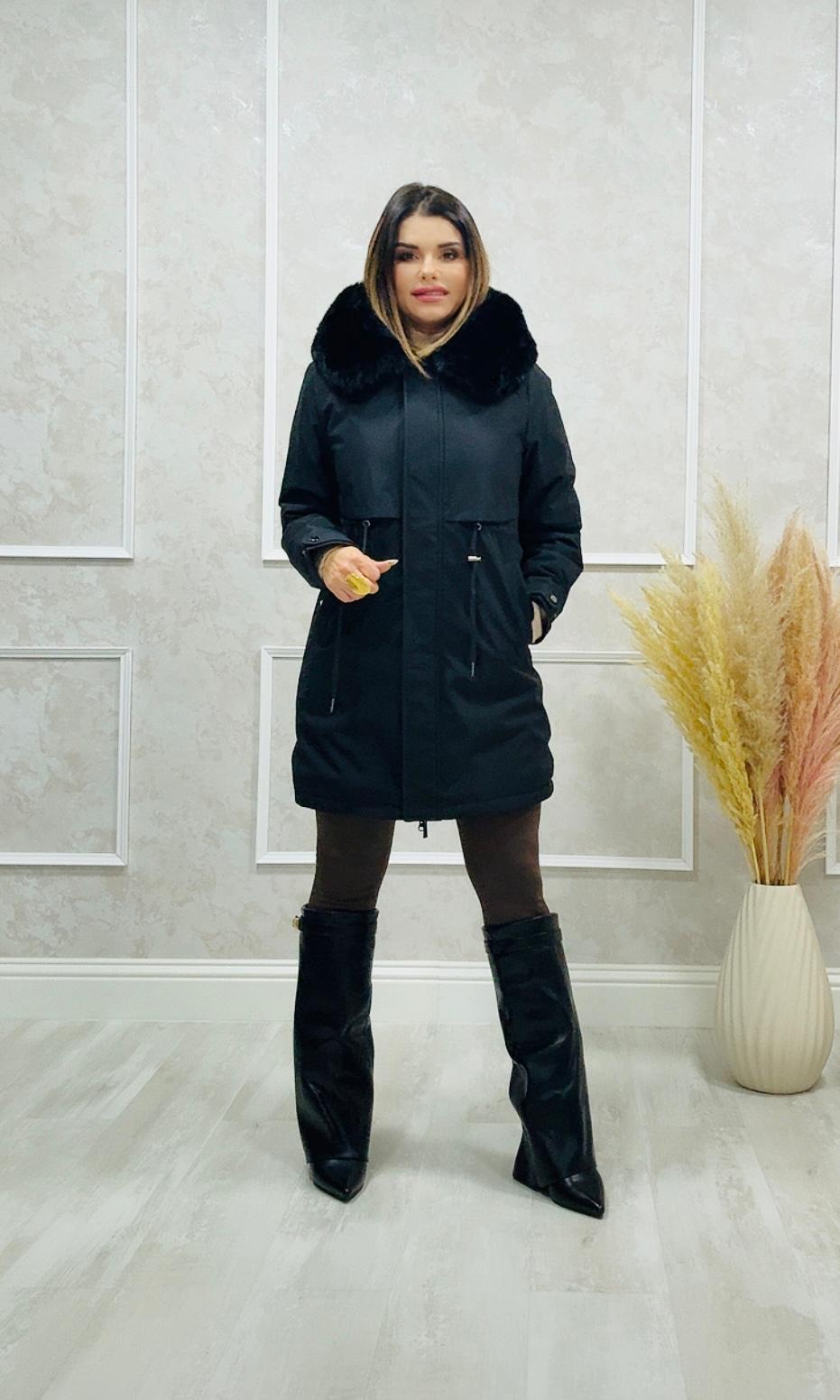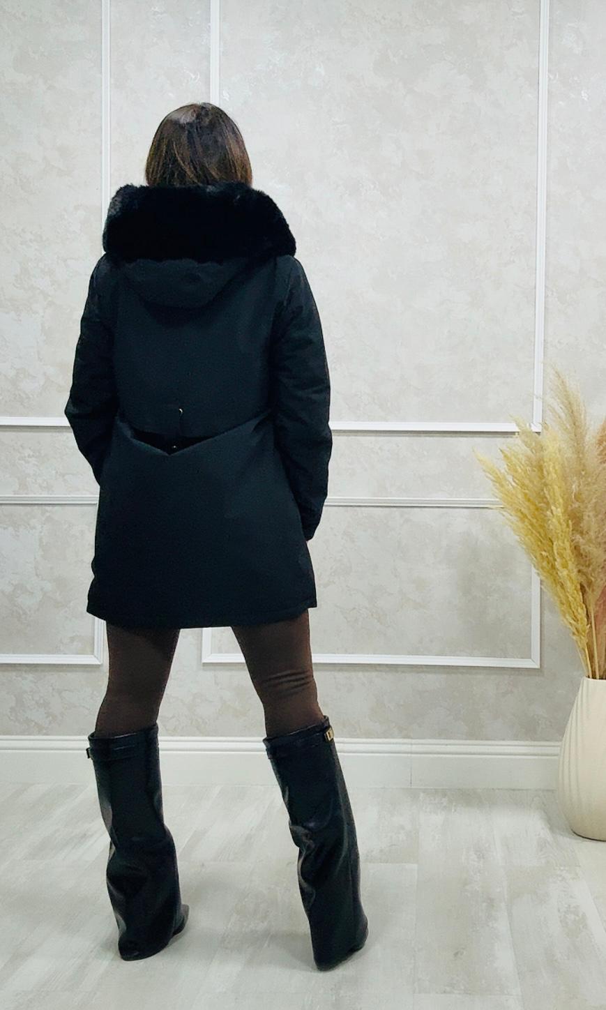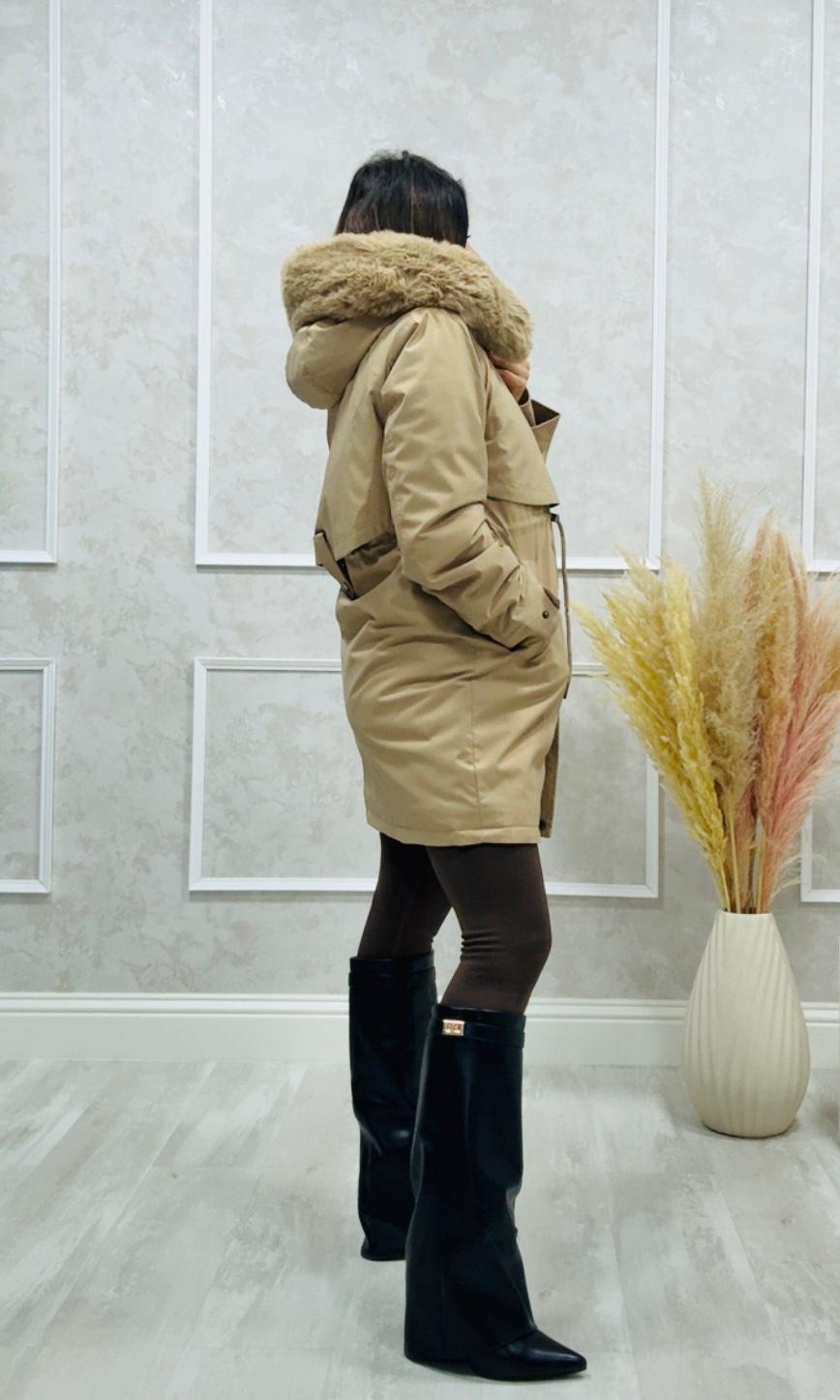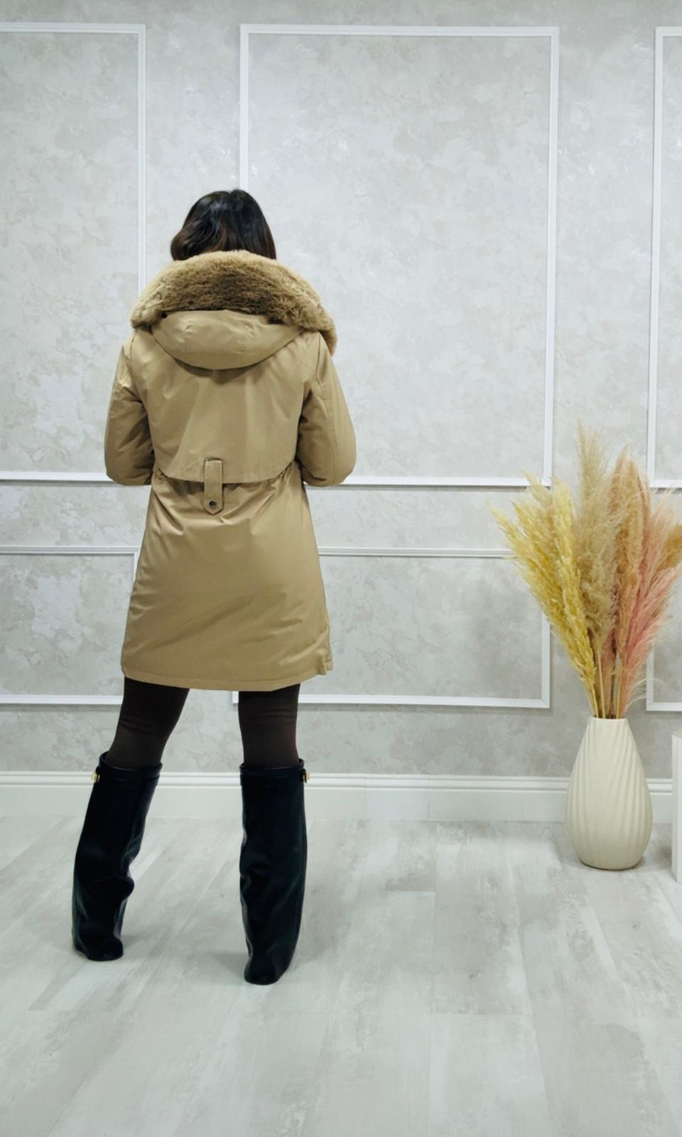 Tiene capucha y cuello de pelo que se puede quitar.