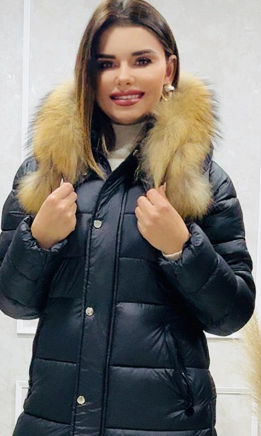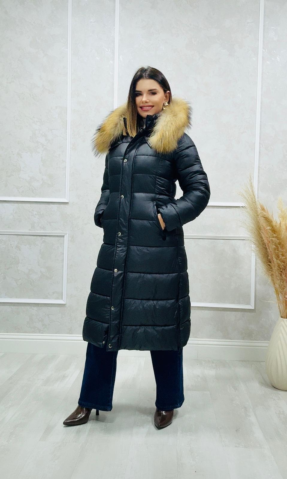 Tiene capucha y cuello de pelo que se pueden quitar.