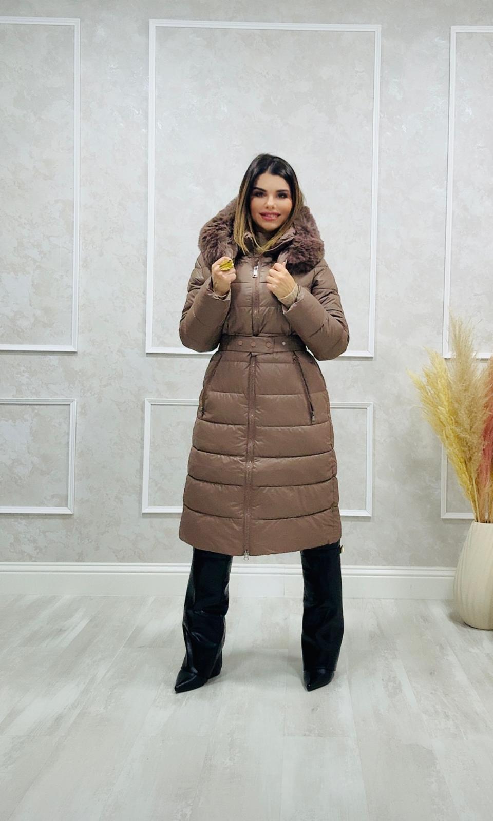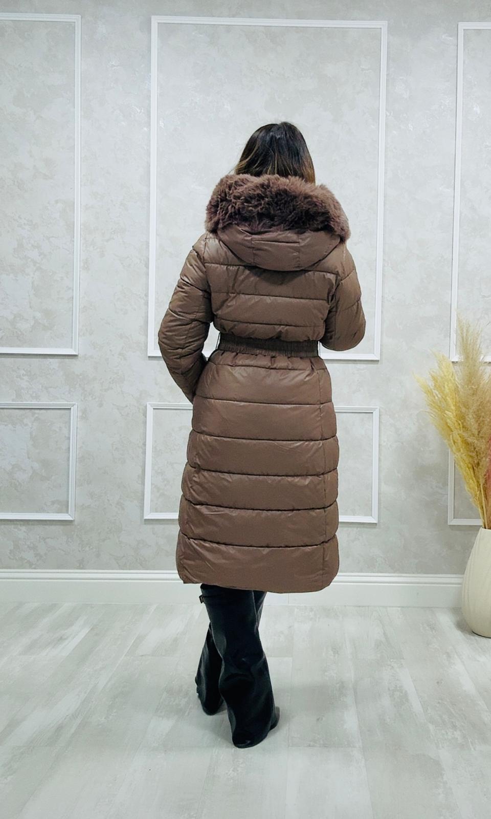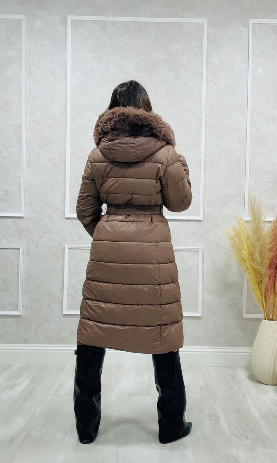 El abrigo tiene capucha con cremallera y cuello de pelo que se pueden quitar.