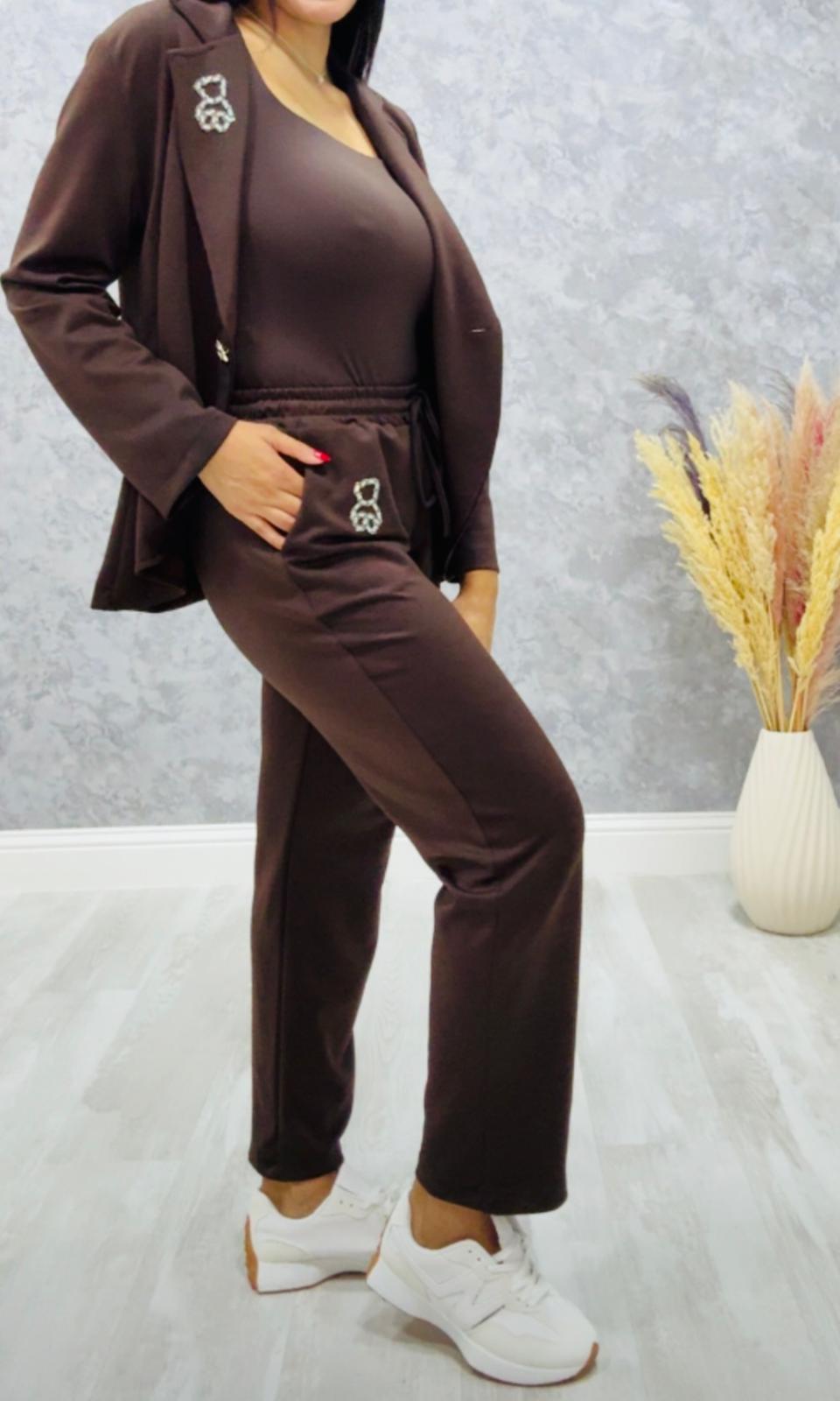 Tela no elástica, con puntitos de brillo, el pantalón tiene goma en la cintura y bolsillos laterales