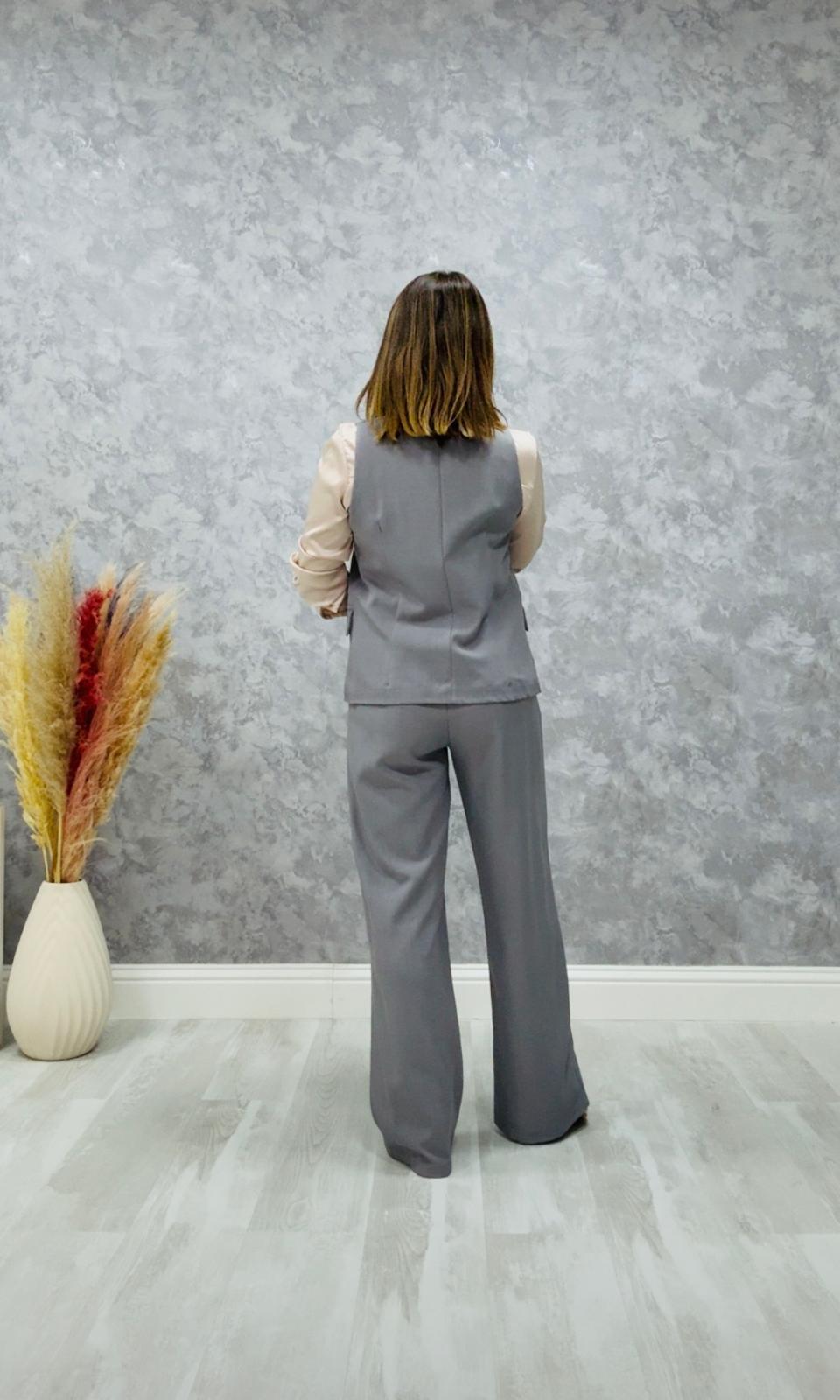 Tela sin elasticidad, el chaleco lleva forro, el pantalon va con goma en la parte trasera de la cintura y bolsillos laterales