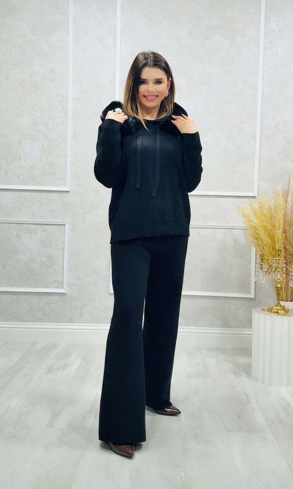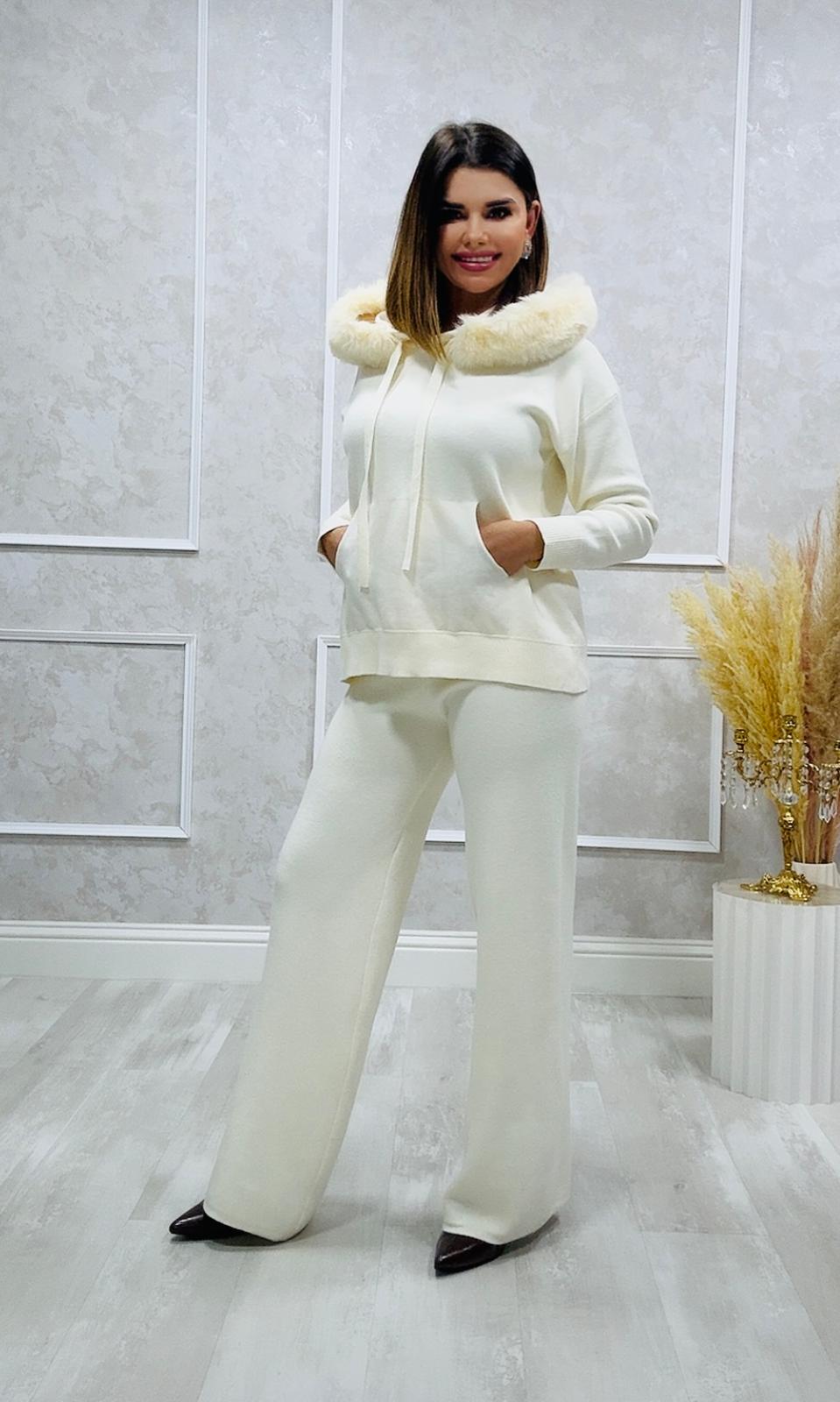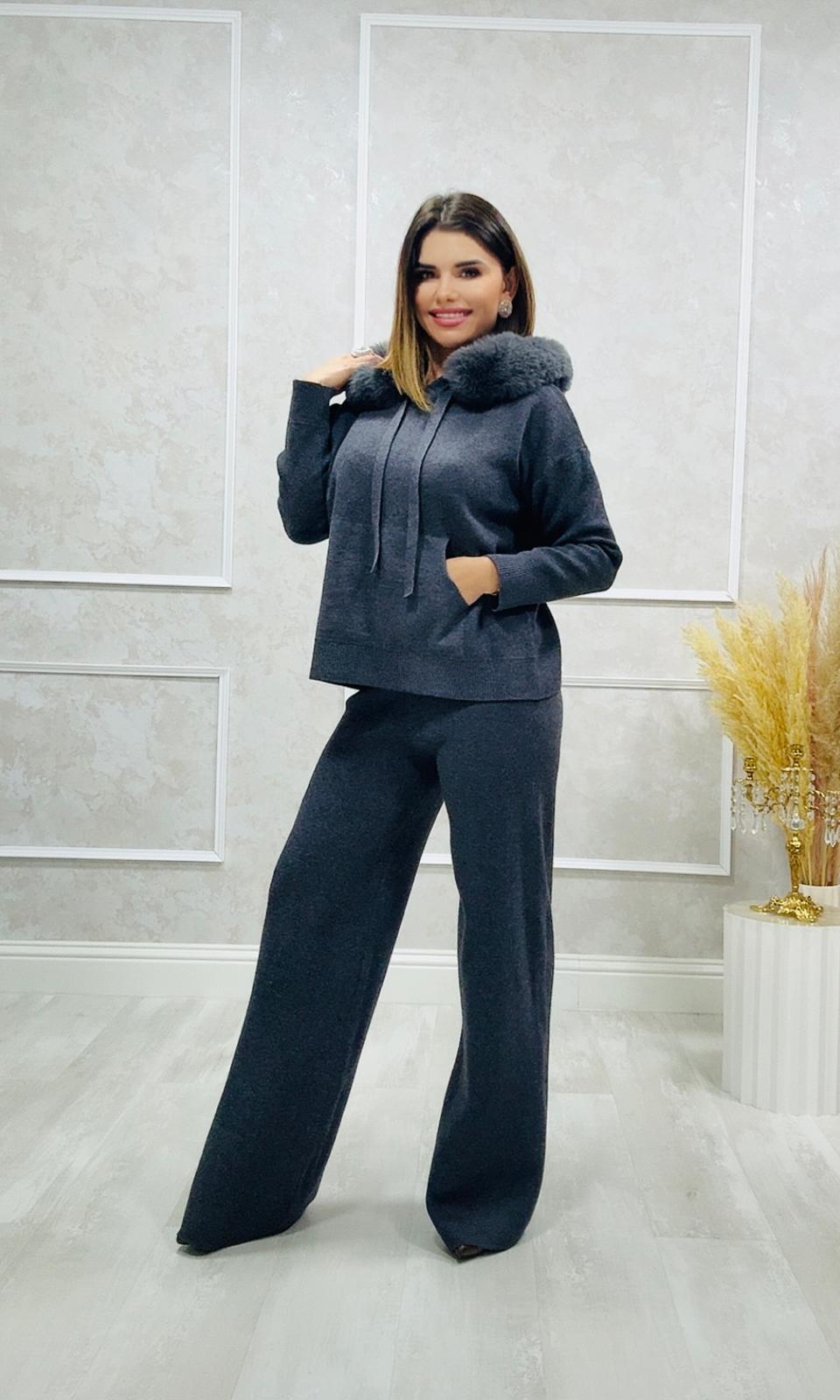 El jersey lleva capucha con cordón, cuello de pelo que se puede quitar y bolsillos en la parte frontal.