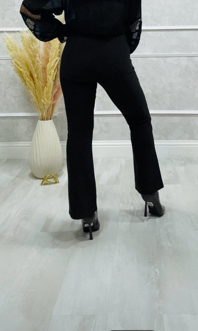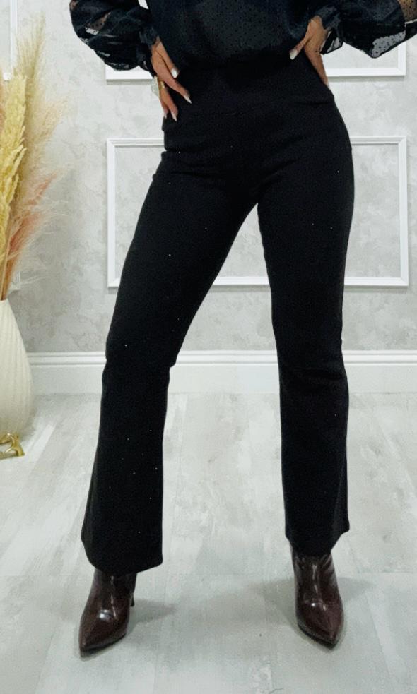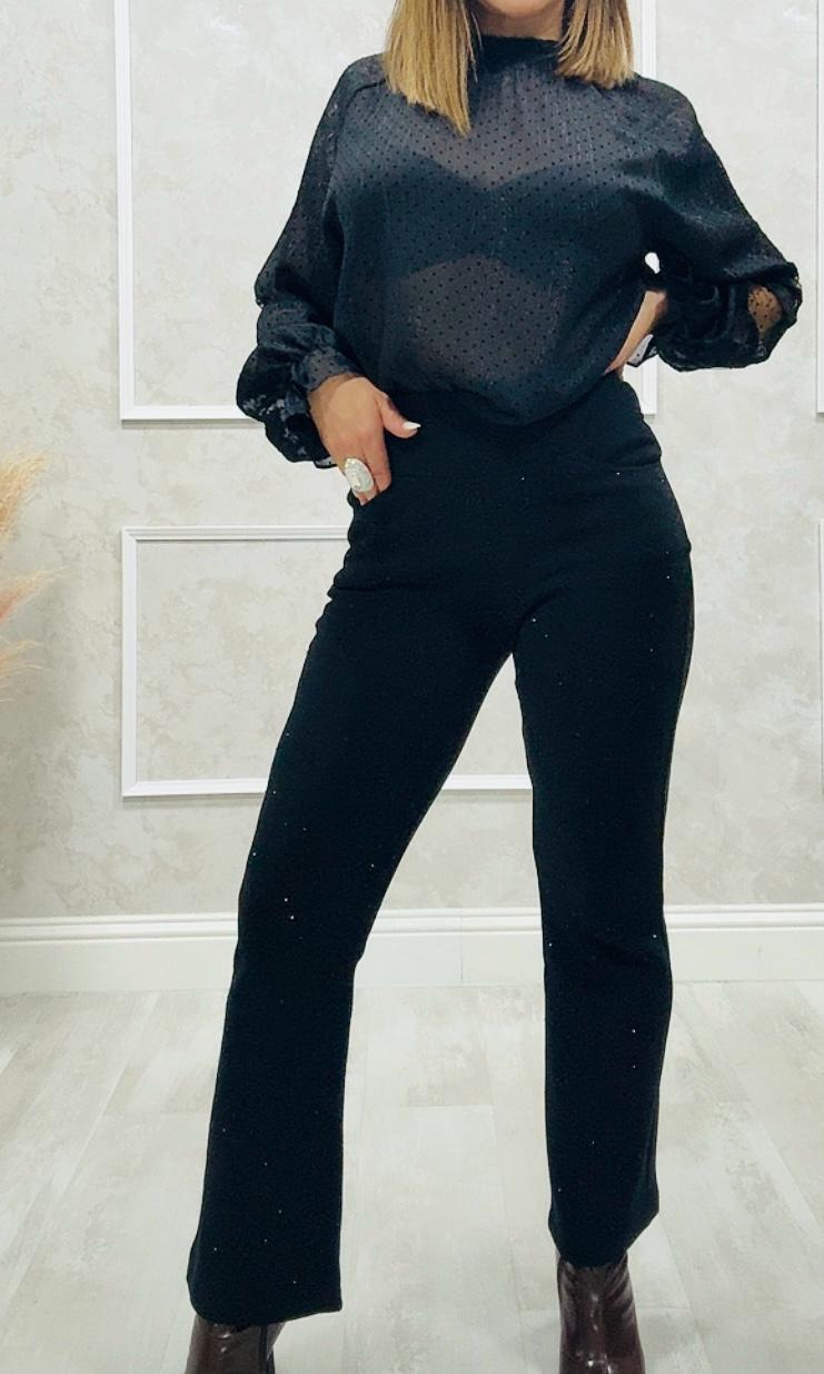 Tela no elástica, con puntitos de brillo, el pantalón tiene goma en la cintura y bolsillos laterales