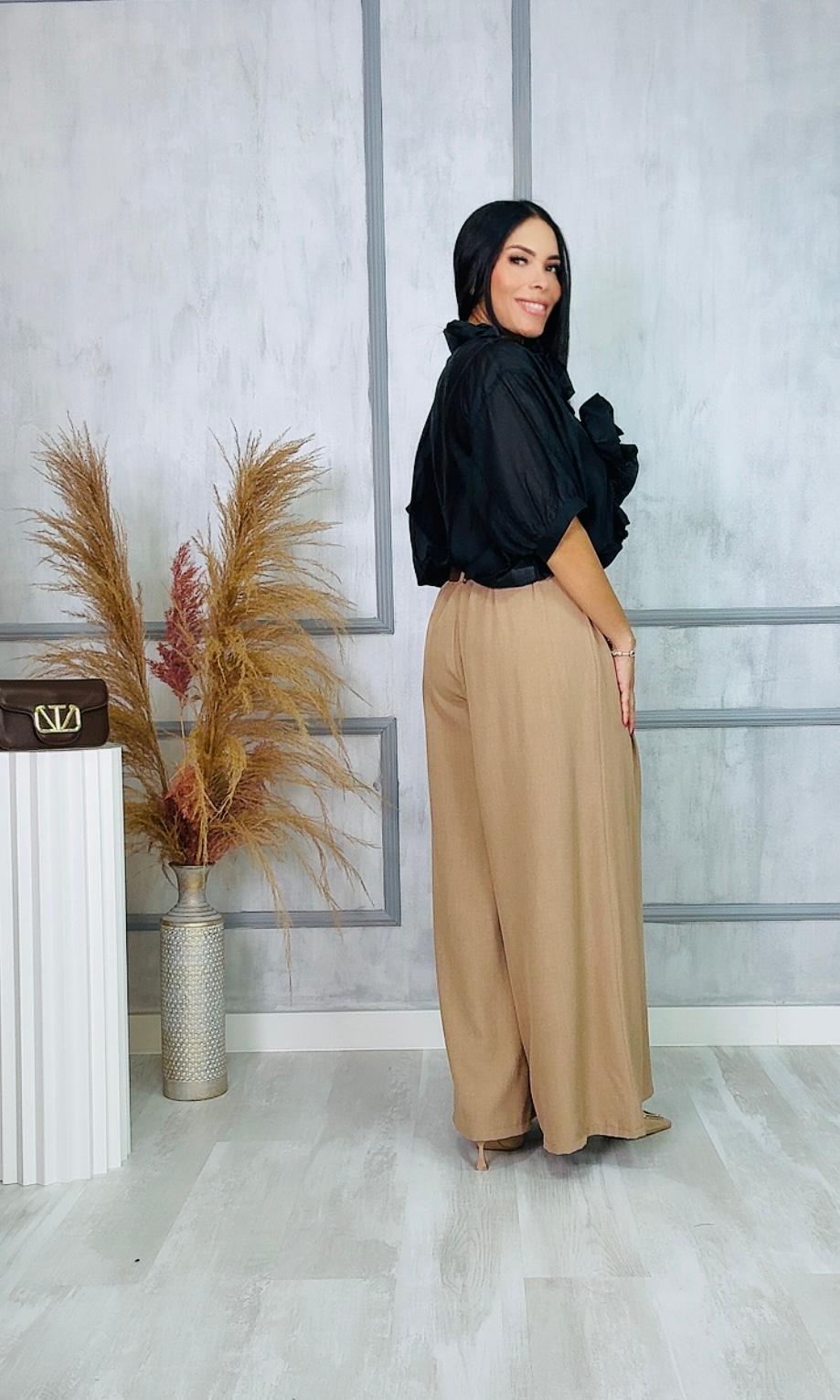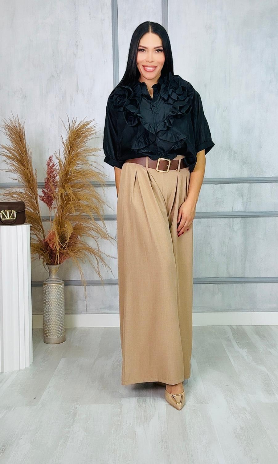 Tela no elástica, lleva goma en la parte trasera de la cintura, incluye cinturón